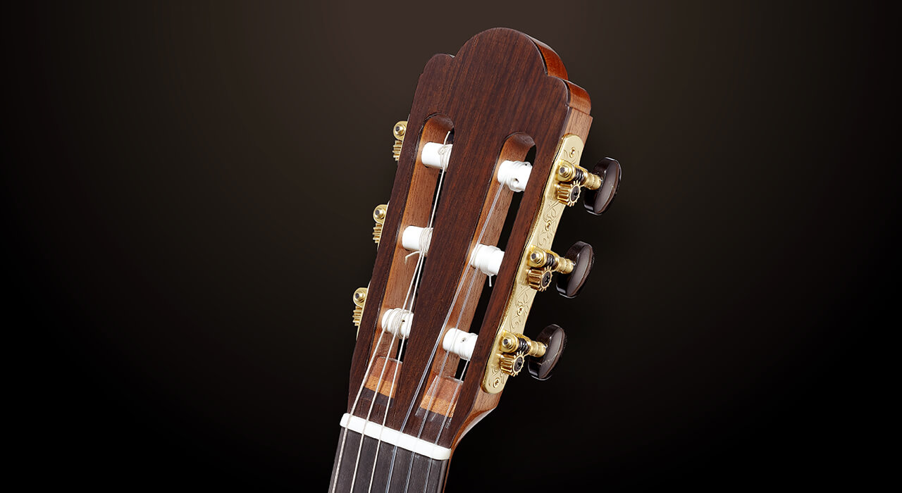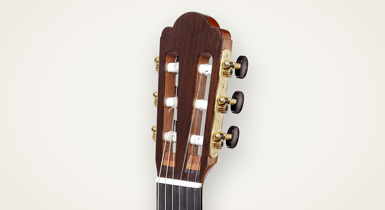 Hauser classical guitar headstock made with rosewood veneer. The headstock is more rounded look design. The rosewood veneer add an elegant touch to the detail. GOTOH machinehead is use for precise tuning.
