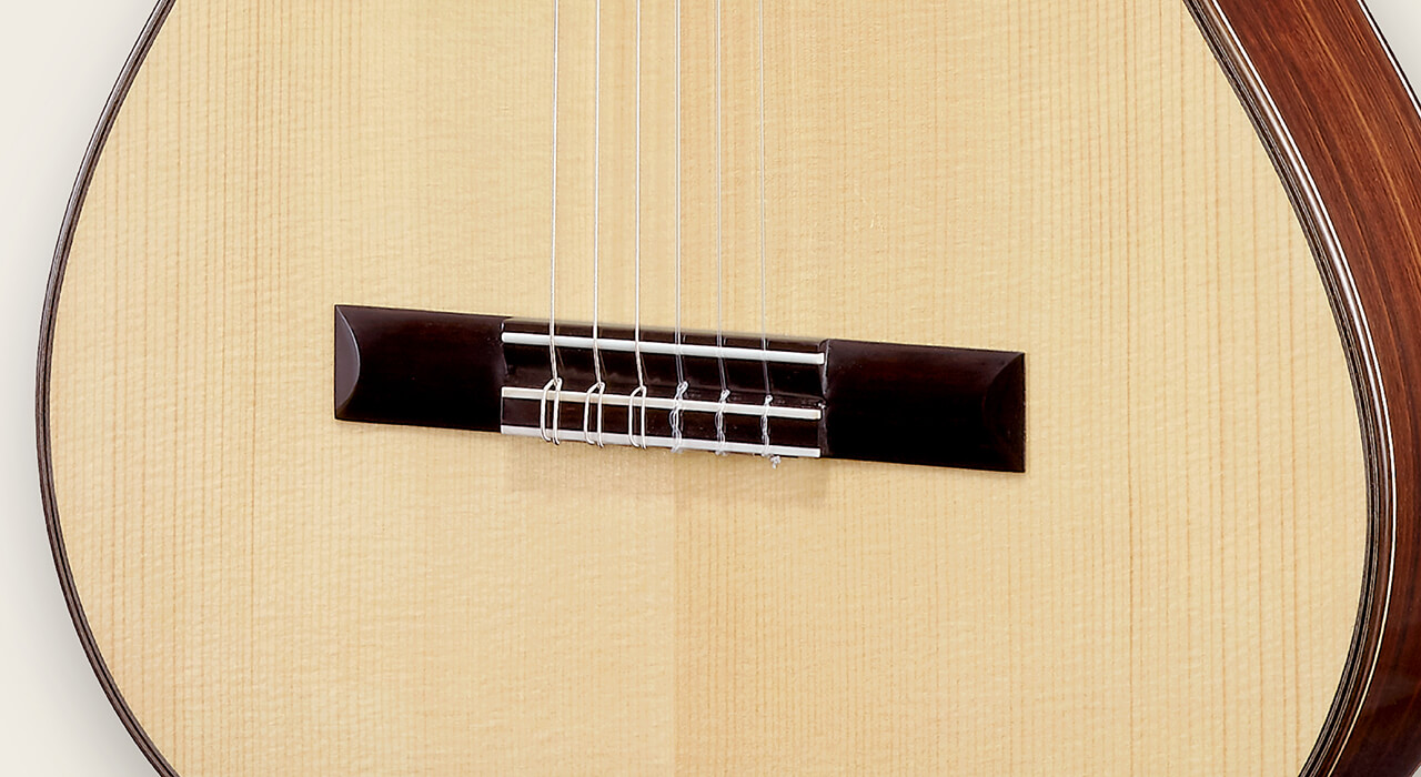 Traditional rectangular rosewood bridge helps support the string tension. Bone added at edge of bridge to protect string tension against the wood. The buffalo bone for the nut which is very hard and articulate. This helps the strings to vibrate and to have a deep resonance.