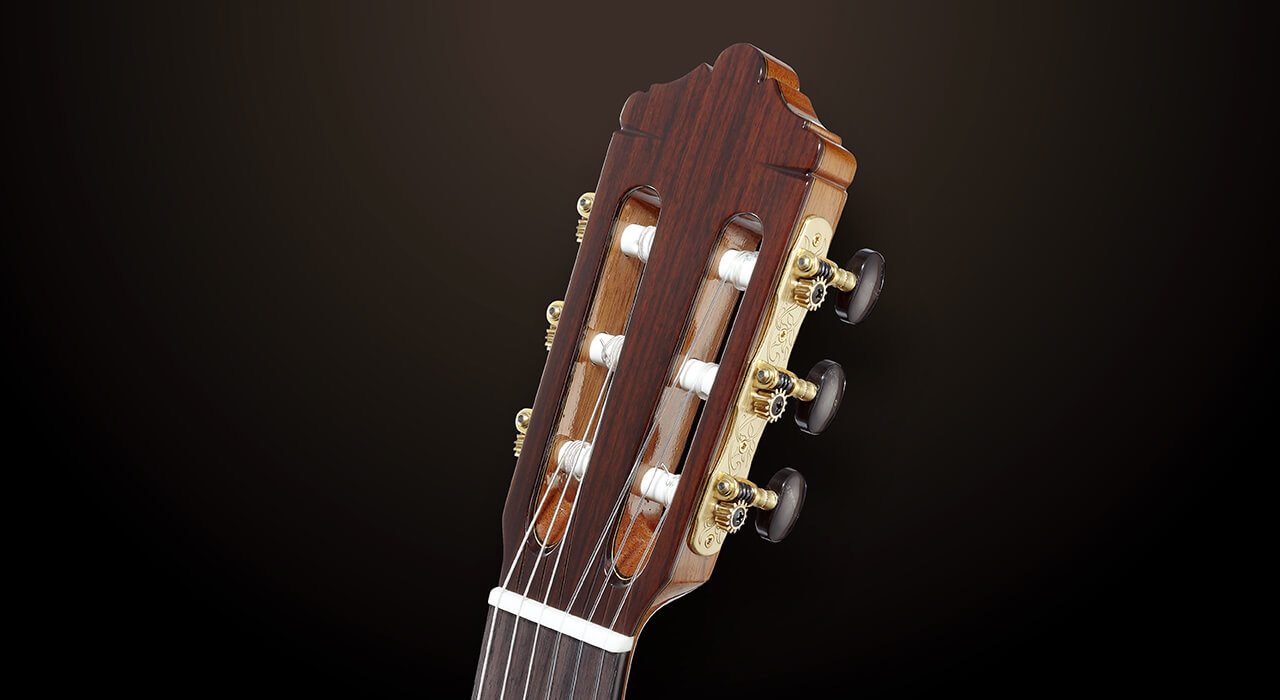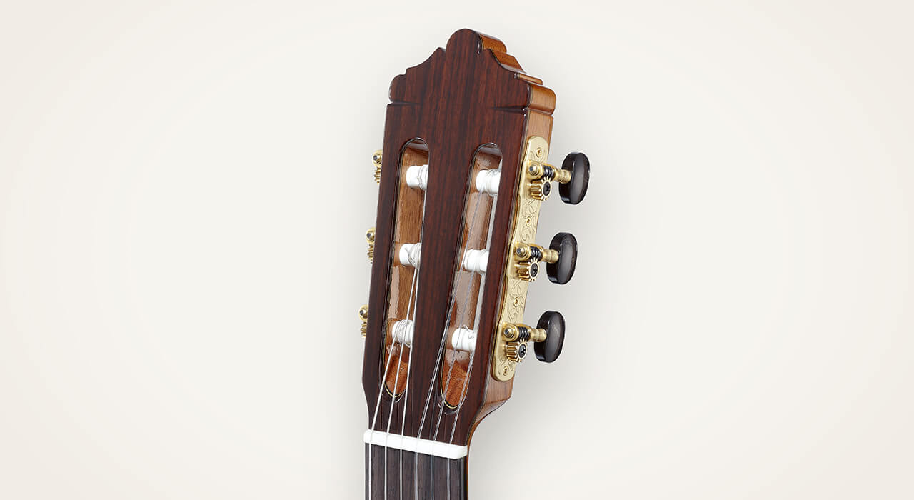 Montoya classical guitar headstock made with rosewood veneer. GOTOH machinehead is use for precise tuning.