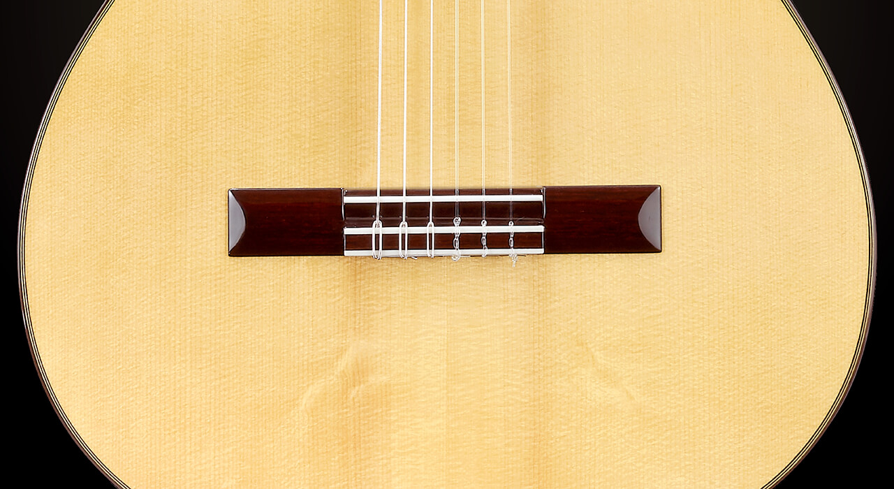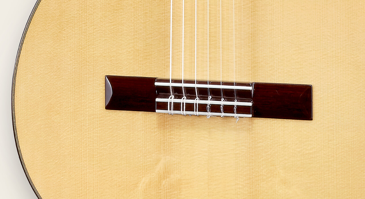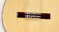 Traditional rectangular rosewood bridge helps support the string tension. Bone added at edge of bridge to protect string tension against the wood. The buffalo bone for the nut which is very hard and articulate. This helps the strings to vibrate and to have a deep resonance.