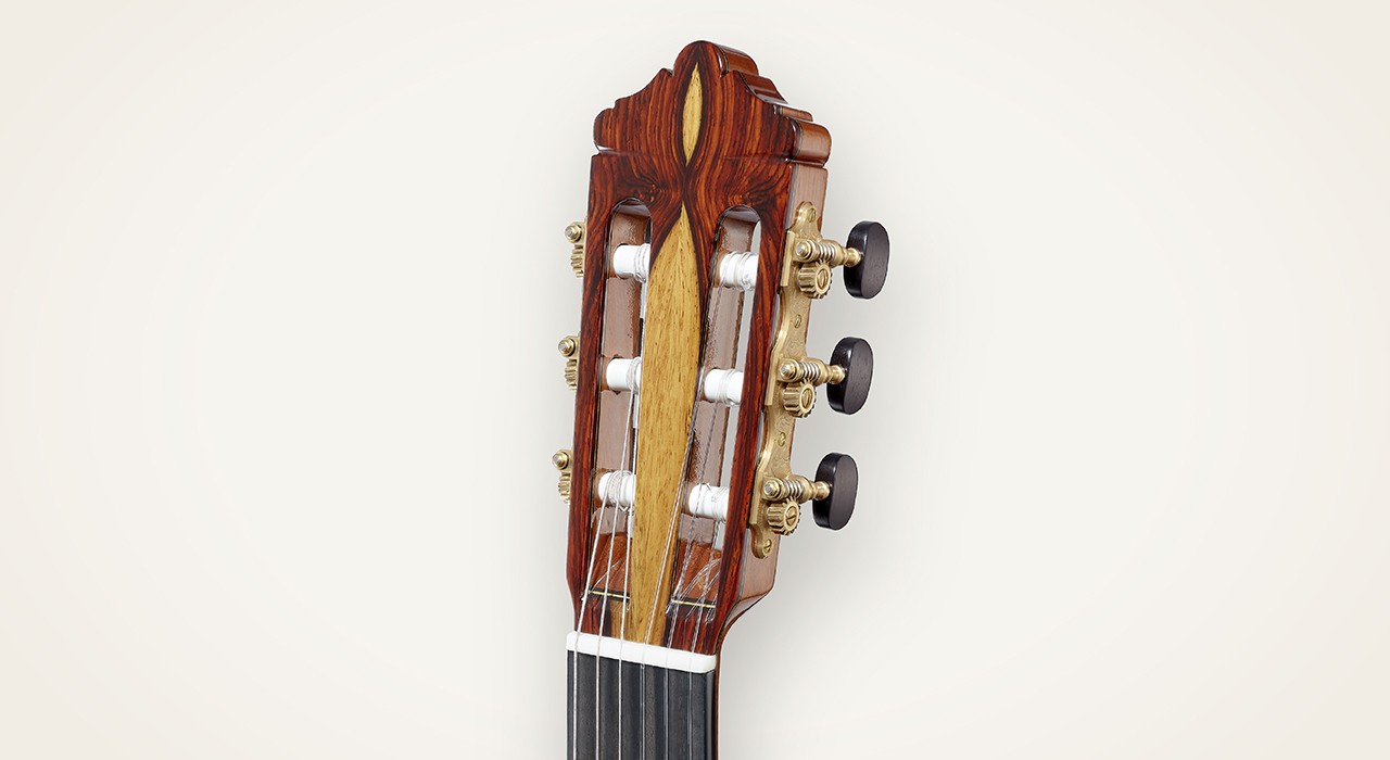 Montoya classical guitar headstock made with Madagascar rosewood veneer. GOTOH gold machinehead is use for precise tuning with 1:16 tuning ratio.