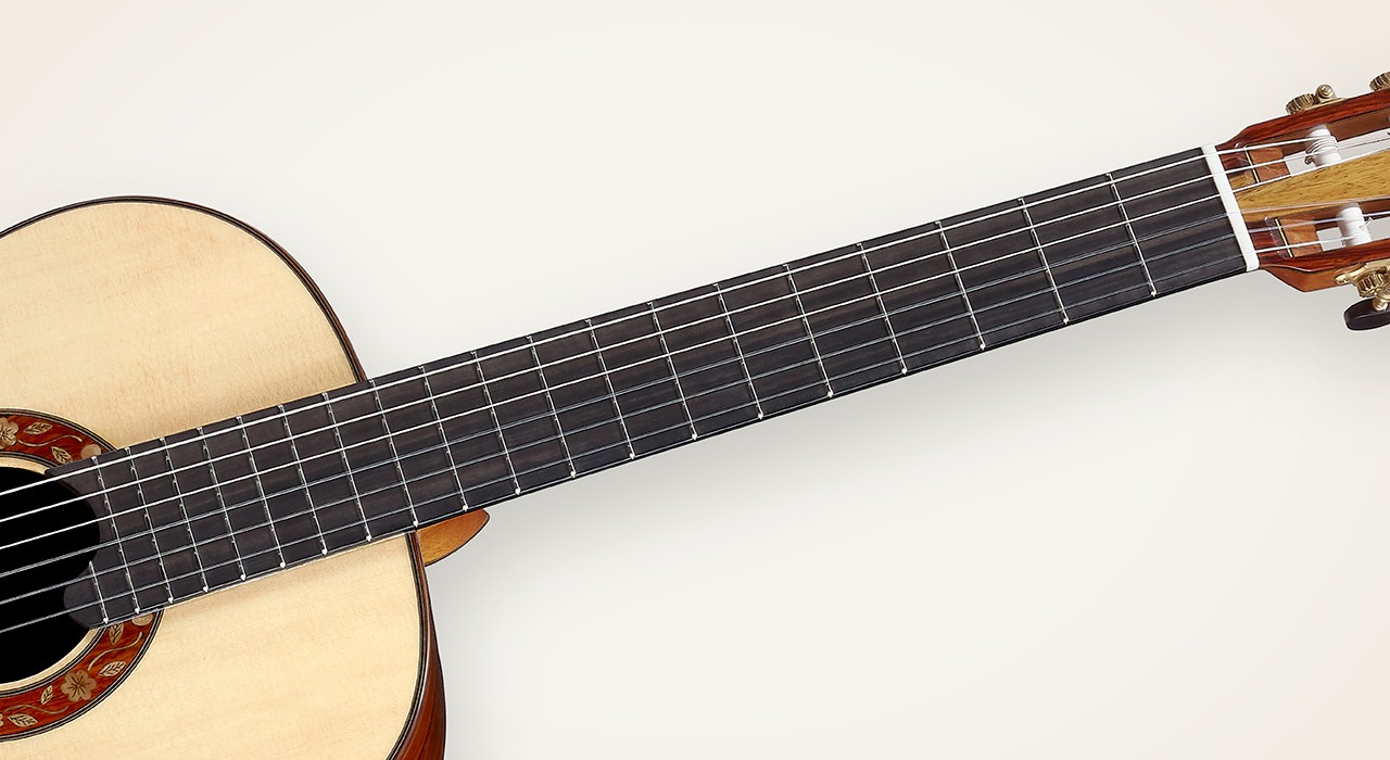 Ebony is a hard dense tone wood with silky smooth feeling. It's a stable wood to be a fretboard, adds brightness to the tone, and faster attack. Spanish Cedar neck for strength and stability.