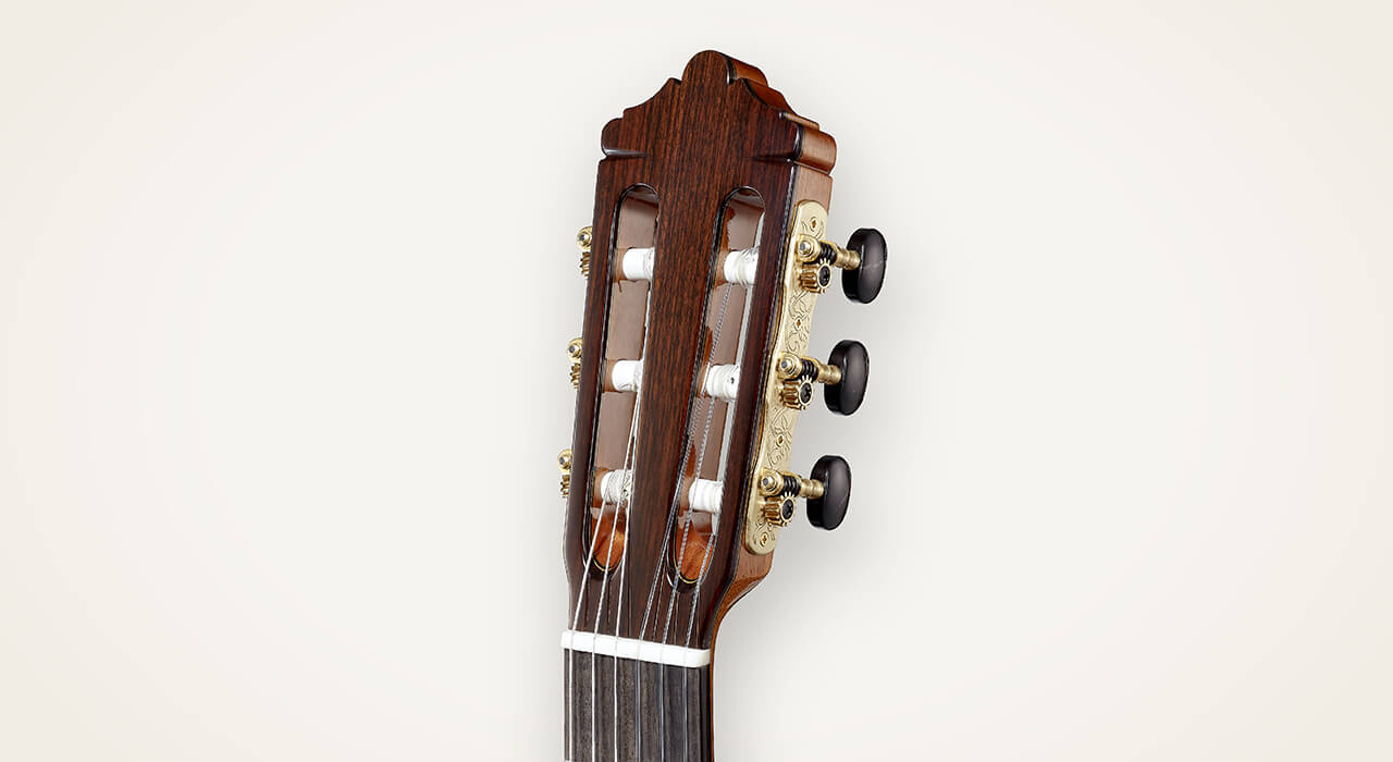 Montoya classical guitar headstock made with Madagascar rosewood veneer. GOTOH machinehead is use for precise tuning.