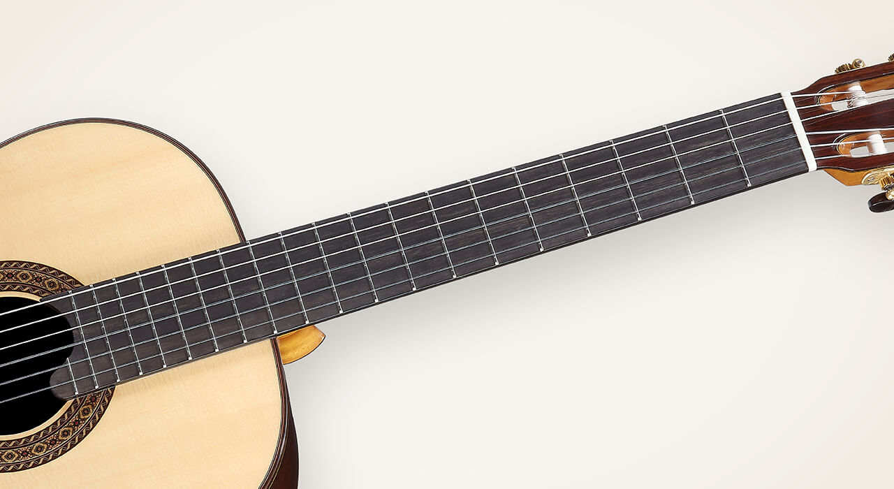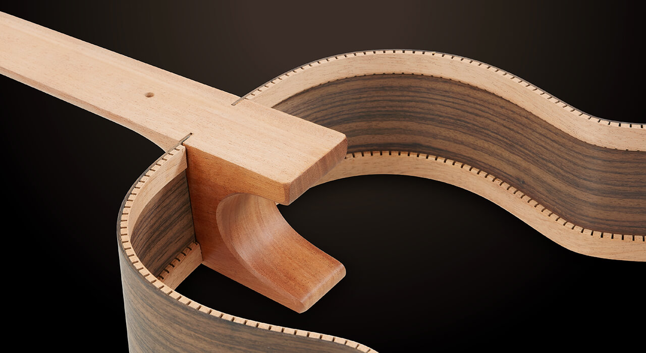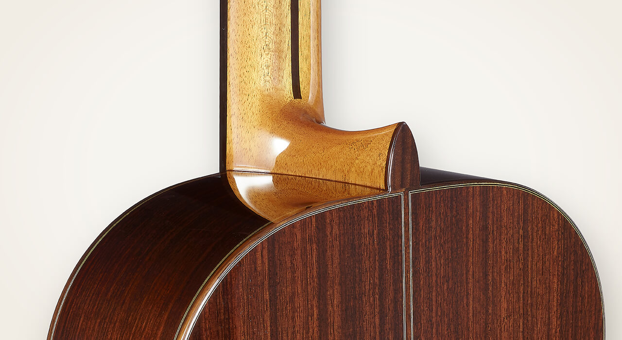 Montoya use traditional Spanish neck joint construction. The neck is one piece extends into the body and to the base of the neck, then the back and sides are jointed directly to the neck base block. It stabilize the neck, and improve the resonance.
