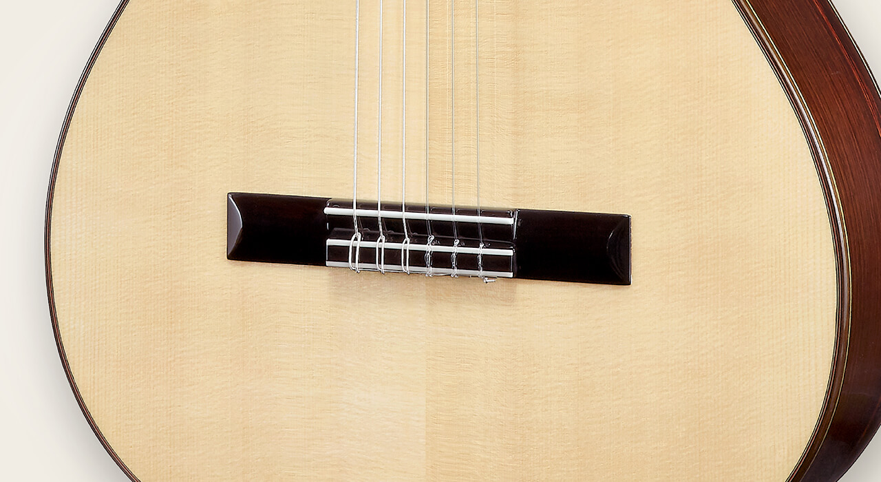 Traditional rectangular rosewood bridge helps support the string tension. Bone added at edge of bridge to protect string tension against the wood. The buffalo bone for the nut which is very hard and articulate. This helps the strings to vibrate and to have a deep resonance.